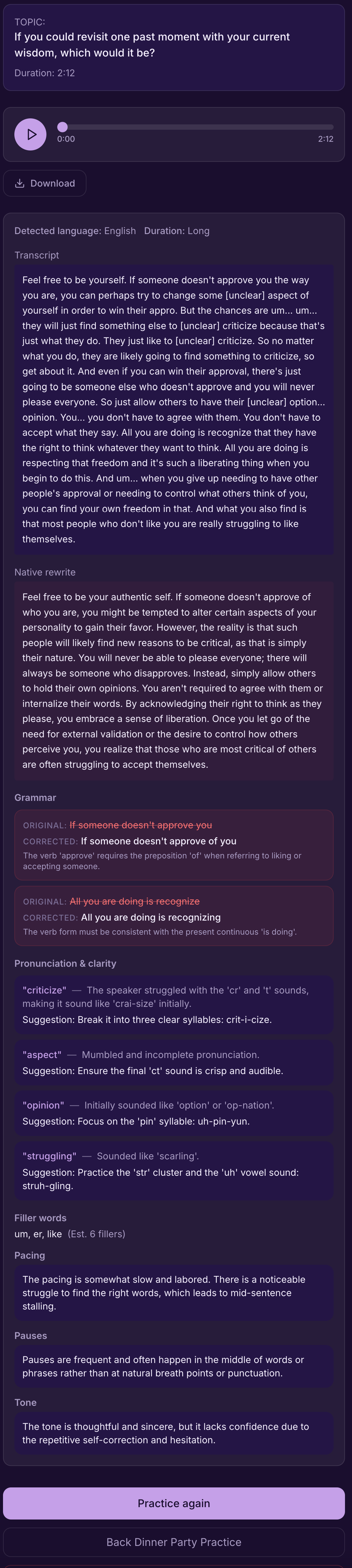 After a dinner party practice session, you can record your speech and get an AI-generated report covering grammar, pronunciation, pacing, tone, filler words, and more. It helps you improve your conversational skills for your next dinner party.